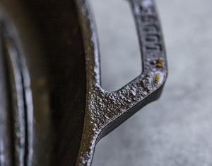 Možda ima crnih taloga od prirodnog neprianjajućeg premaza (začina) vašeg posuđa od lijevanog željeza. Oni uopće nisu štetni i smanjuju se kako se posuđe koristi tijekom vremena. Mogu se pojaviti prilikom kuhanja tekućina, kipuće vode, korištenja sapuna na potpuno novom posuđu ili kuhanja kisele i alkalne hrane kao što su grah i rajčice.